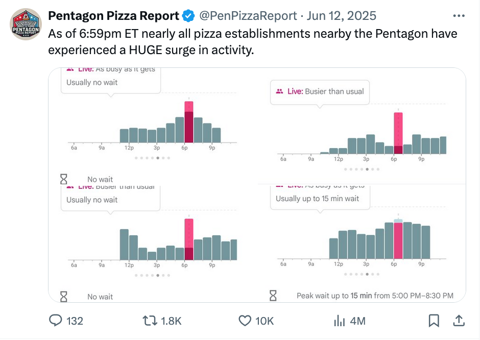 Hours before news broke on Israel’s major attack on Iran on June 12, for example, Pentagon Pizza Report noted a surge in Google Maps activity from four pizza places near the Pentagon around 7 p.m. — a signal military leaders were staying in place to monitor unfolding events. “As of 6:59 p.m. ET nearly all pizza establishments nearby the Pentagon have experienced a HUGE surge in activity,” according to a post on X by the account. Do you think the Pentagon Pizza Report account is a threat to national security and should be banned?