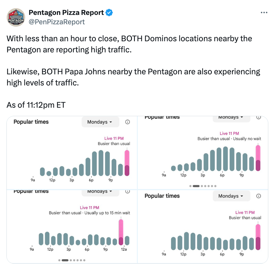 Created in August 2024, the Pentagon Pizza Report account is not the first means through which the public has tracked pizza deliveries in relation to military activity, an observation that has taken place since the 1980s. “The news media doesn’t always know when something big is going to happen because they’re in bed, but our [pizza] deliverers are out there at 2 in the morning,” Frank Meeks, an owner of 43 Domino’s outlets in the Washington area, told the Los Angeles Times in January 1991. He pointed out that on the night of Aug. 1, 1990, the CIA ordered 21 pizzas — a one-night record at the time — hours before Iraqi forces invaded Kuwait and started the Gulf War. Do you think there’s a White House Hamburger index too?