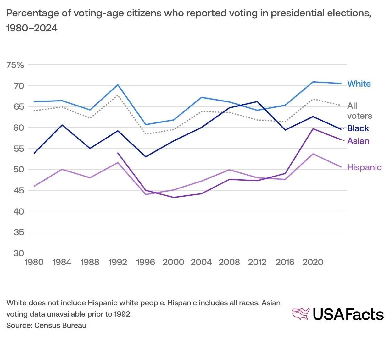 2. According to the data from the visual above, what racial group had the consistently lowest voter turnout rate since 1980?