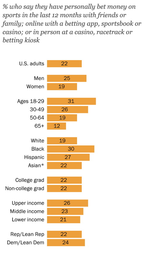Some groups of Americans are more likely than others to say they’ve personally bet money on sports in the past year. According to the visual below* what age group is most likely to bet money on sports?