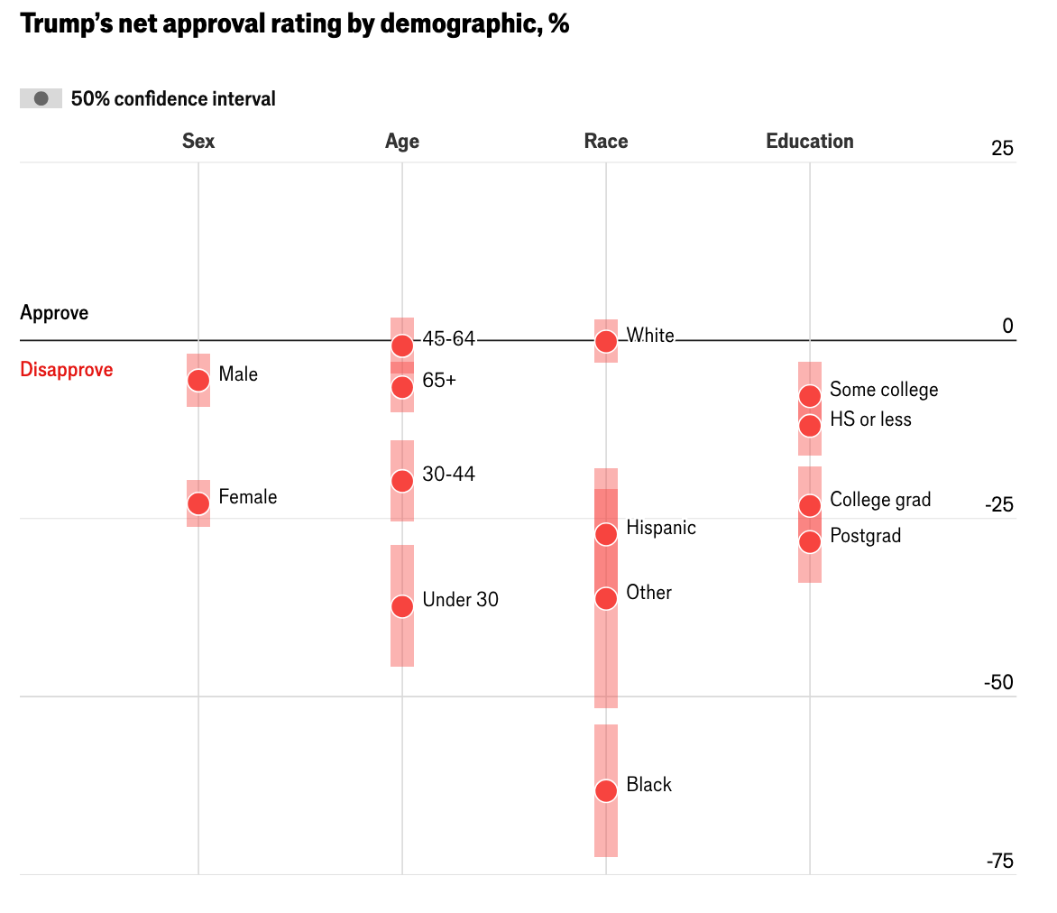 According to the visual below* what demographic groups most support President Trump and what groups least support the president?