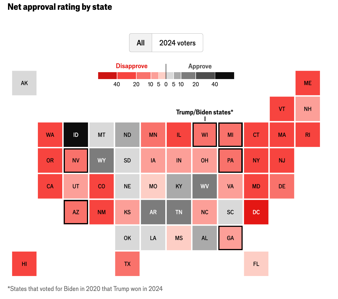 Based on the numbers from the visuals above and below, if history is any judge, President Trump’s approval rating will likely continue to go down. How do you predict Trump’s approval will impact his ability to implement policy and his party’s chances in the 2026 midterm elections?
