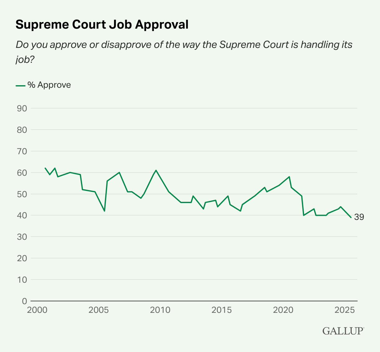 2. Based on the data from the visual above, over the past 25 years describe one trend in approval of the Supreme Court?