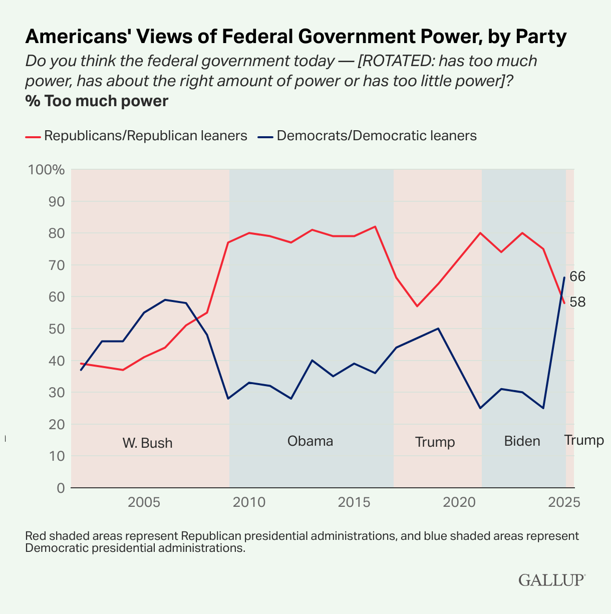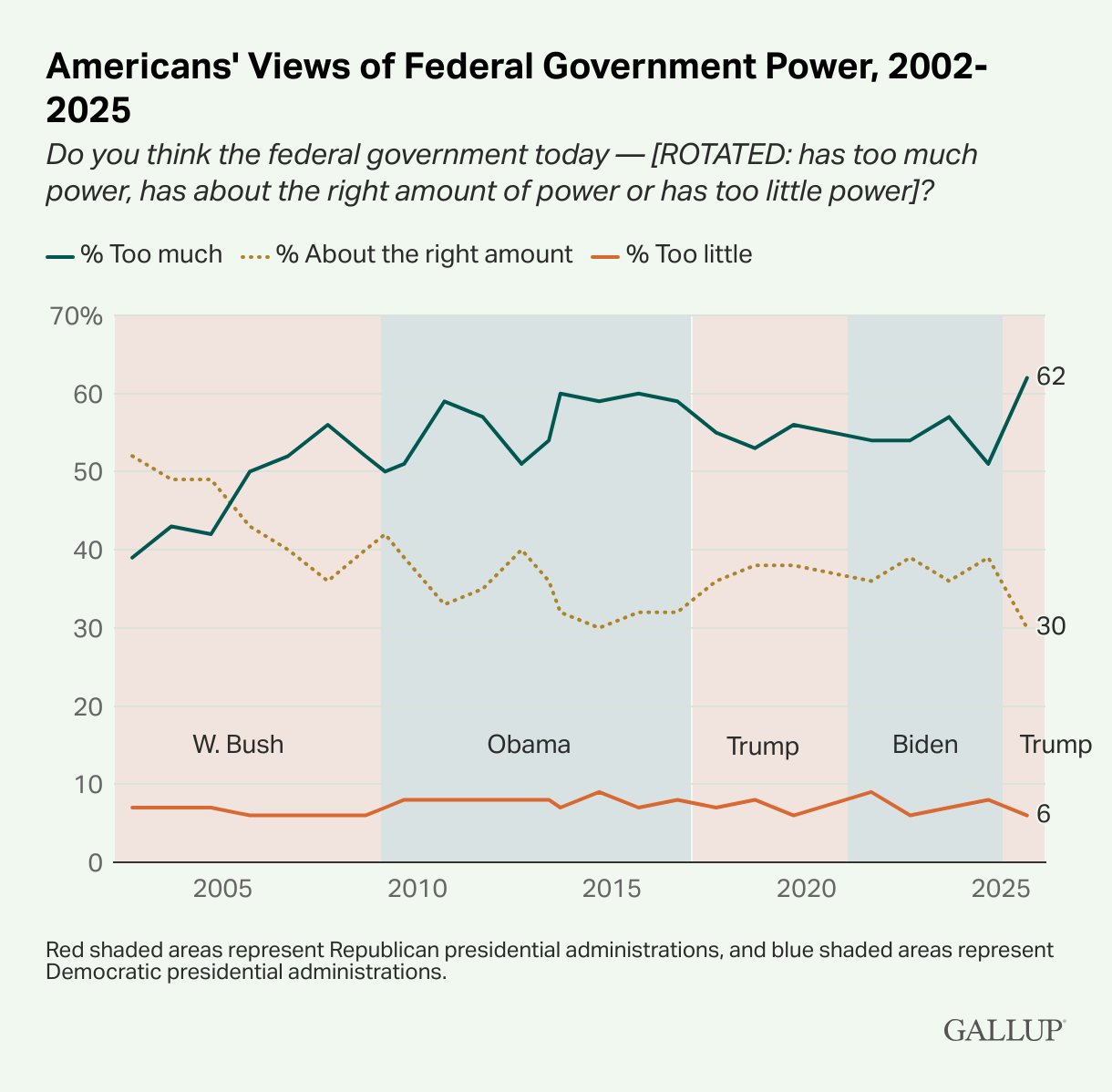 In 2002 when this survey was first taken, only 39% of Americans said that the government had too much power. Describe the trajectory of American opinion on the power of the U.S. government between 2002 and 2025.