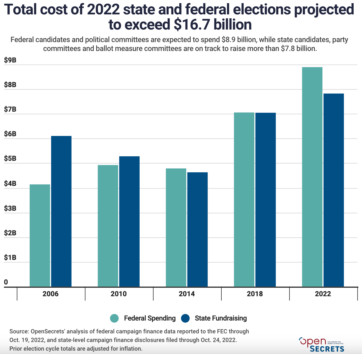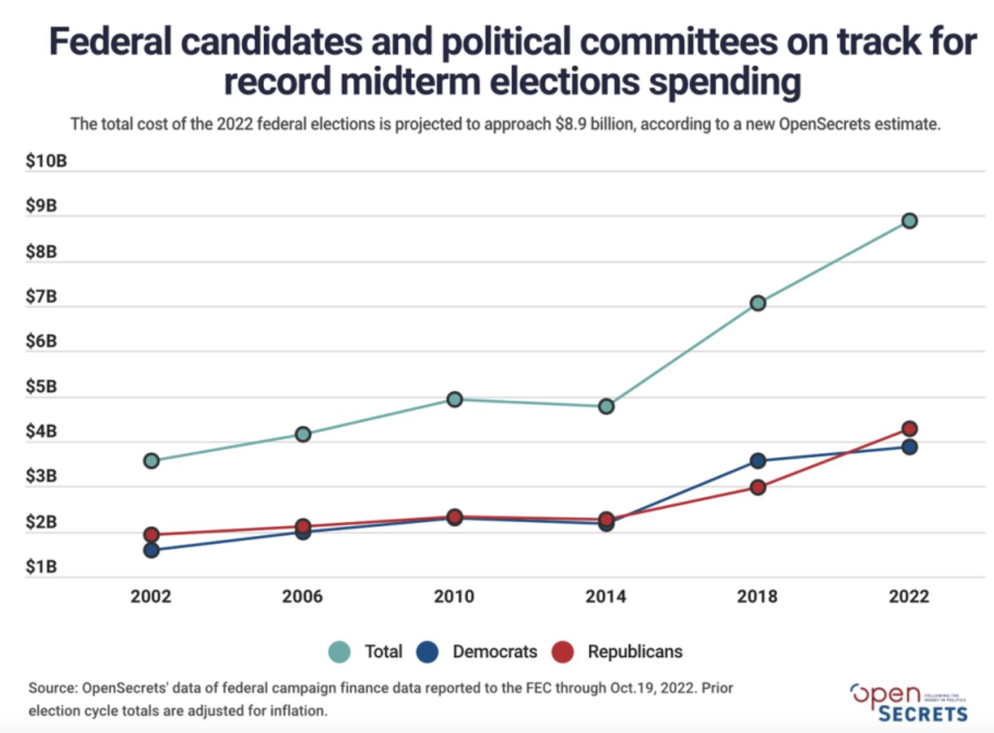 According to the data from the visual, how much money was spent on the 2022 (our most recent) midterm election?