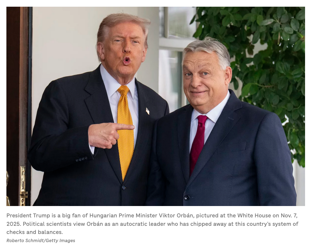 Viktor Orbán (pictured below*)significantly dismantled Hungarian democracy since he began his rule in 2010 by consolidating power, transforming it into what he calls an “illiberal democracy.” Through constitutional changes, gerrymandering, and control over media and courts, Orbán’s Fidesz party created a "partly free" state marked by unfair election advantages, weakened checks and balances, and a narrowed political space. Orbán - an inspiration to Donald Trump who has praised him as a "strong leader" - destroyed Hungarian democracy through Electoral System Manipulation, Media and Judiciary Control, Constitutional Changes, and "Free but Not Fair" Elections. Because of this, Under Orbán, Freedom House reclassified Hungary from "Free" to "Partly Free," making it the first EU member to be categorized as such. Orbán was kicked out of office in last week’s elections. Do you think the U.S. can alter its anti-democratic trajectory?