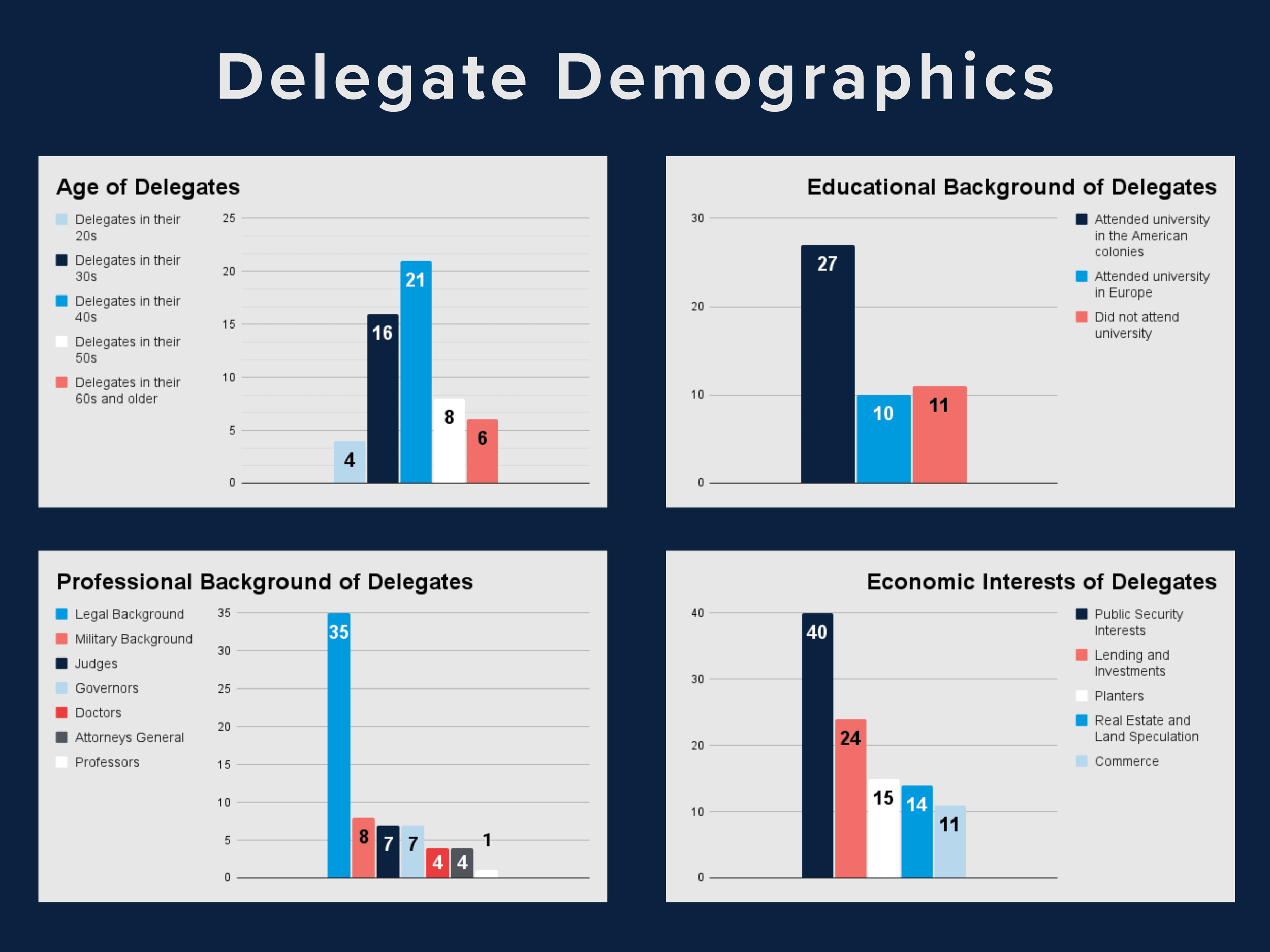 55 men met in Philadelphia, Pennsylvania, from May 25 to September 17, 1787, to draft the United States Constitution, replacing the existing Articles of Confederation. The average age of the delegates was 42, and four of the most influential delegates—Alexander Hamilton, Edmund Randolph, Gouverneur Morris, and James Madison—were in their thirties. Jonathon Dayton the youngest delegate was only 26 years old, Benjamin Franklin, the oldest, was 81! According to the visual above, how many of the men at the Constitutional Convention were in their 20s?