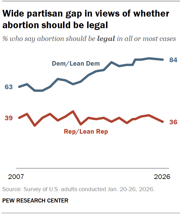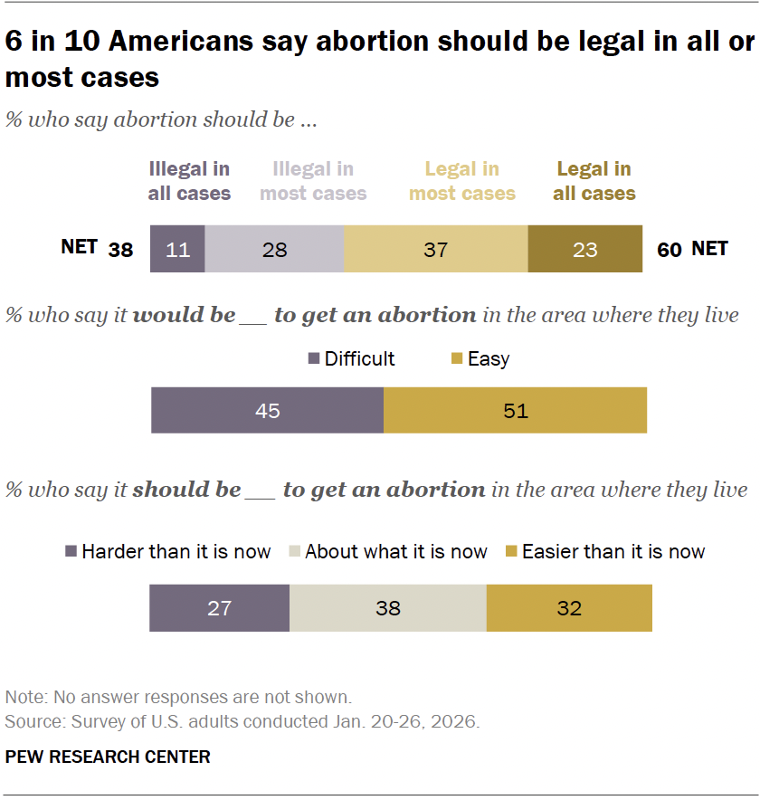 What portion of Americans think abortion to be legal in all or most cases?