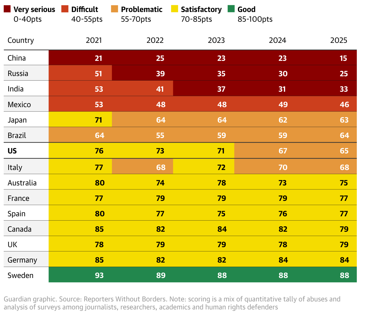 The following countries have more press freedom than the US: Sierra Leon, Liberia, Romania, Cabo Verde, Montenegro, Italy, Trinidad and Tobago, Panama, Ghana, Tonga, Samoa, Fiji, Moldova, Armenia, Namibia, South Africa, Jamaica, Taiwan (the list goes on). America’s freedom of the press score has fallen dramatically in the past 5 years. How does America’s press freedom score make you feel?