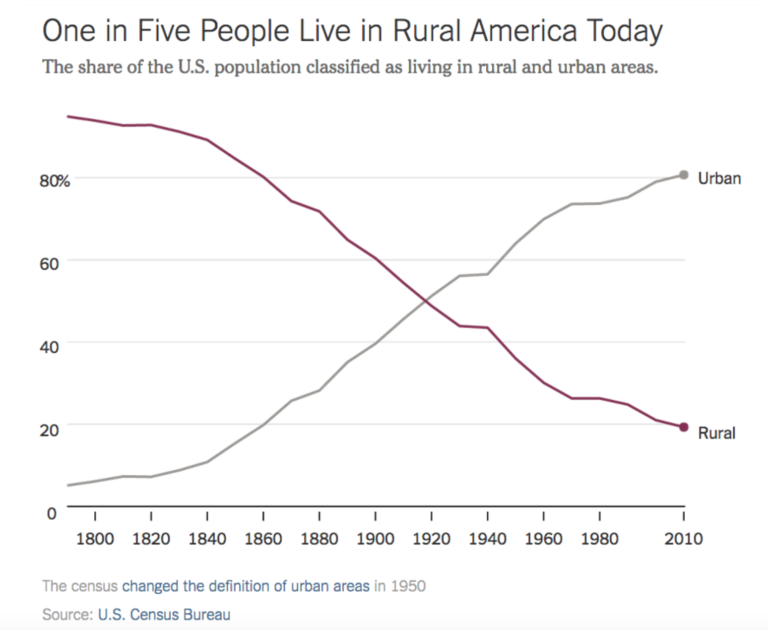 The Census Bureau’s urban-rural classification is a delineation of geographic areas, identifying both individual urban areas and the rural area of the nation. The Census Bureau’s urban areas represent densely developed territory, and encompass residential, commercial, and other non-residential urban land uses. The Census Bureau delineates urban areas after each decennial census by applying specified criteria to decennial census and other data. Rural encompasses all population, housing, and territory not included within an urban area. Identify the area in which you live as either urban or rural. Describe one trend in changes in rural and urban populations in the United States over time?